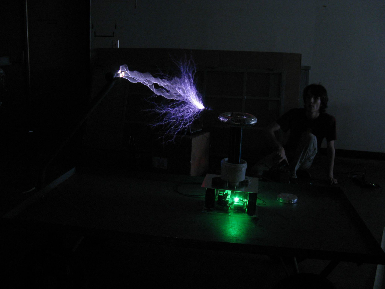Driver: half-bridge of FGH60N60SMD IGBT's Primary: 4.5 turns of 14 AWG on a 3.5" PVC former Secondary: 2.5x7", 36 AWG with a 2x7" topload. Resonant frequency is ~320KHz Tank cap: CDE940C30S68K-F, 0.068 uF@3KV
